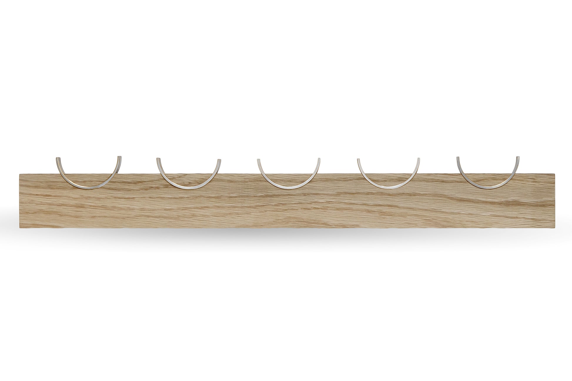Holzgarderobe mit Haken aus Messing, Stahl oder schwarz lackiertem Stahl.