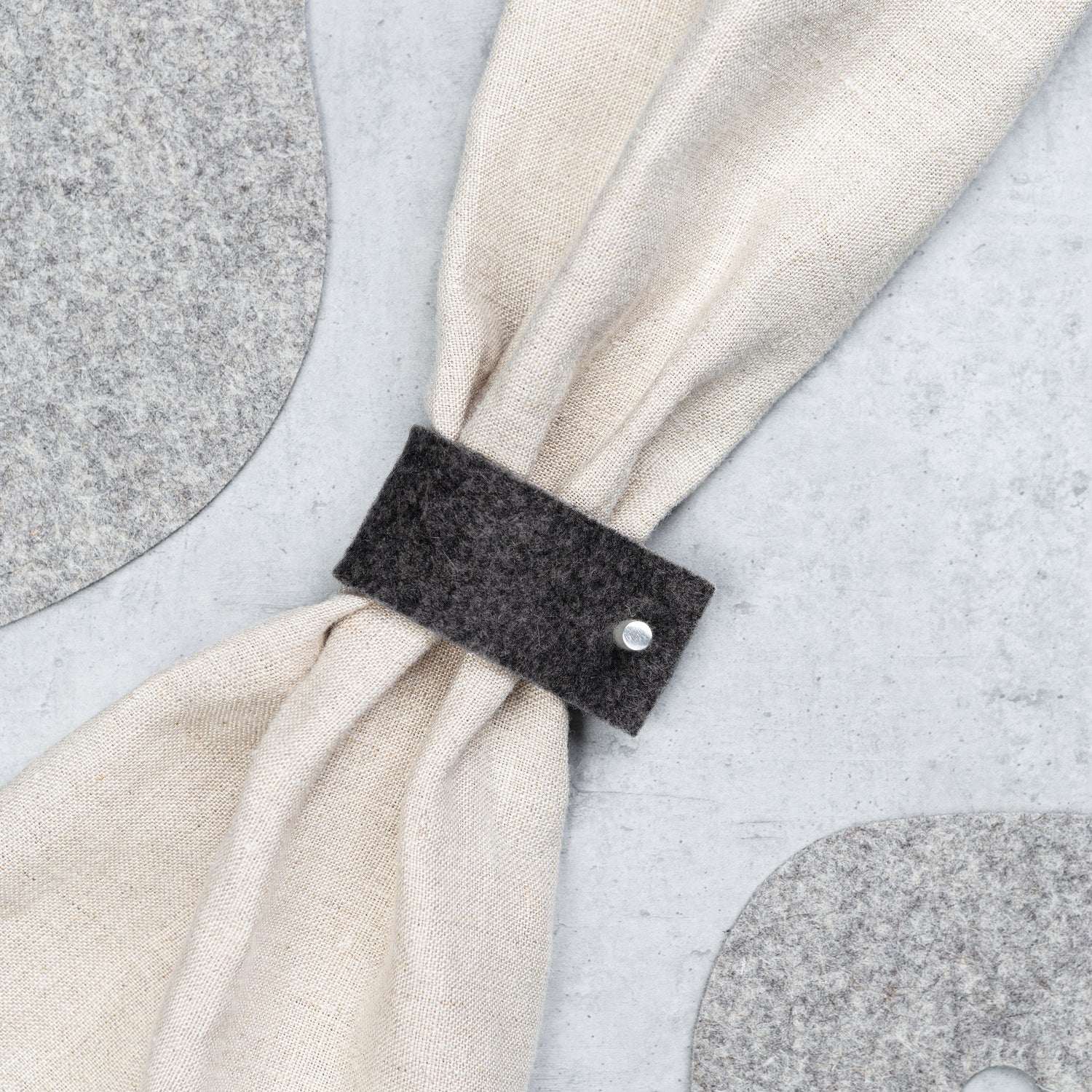 Minimalistische Serviettenringe sind ein elegantes Tischaccessoire – perfekt für festliche Anlässe oder ein gemütliches Abendessen in Ihrem Zuhause. Der Serviettenring ist ein stilvolles Detail für Ihre Servietten und den gesamten Tisch. Hergestellt aus Filzresten (Verschnitte aus der Produktion).