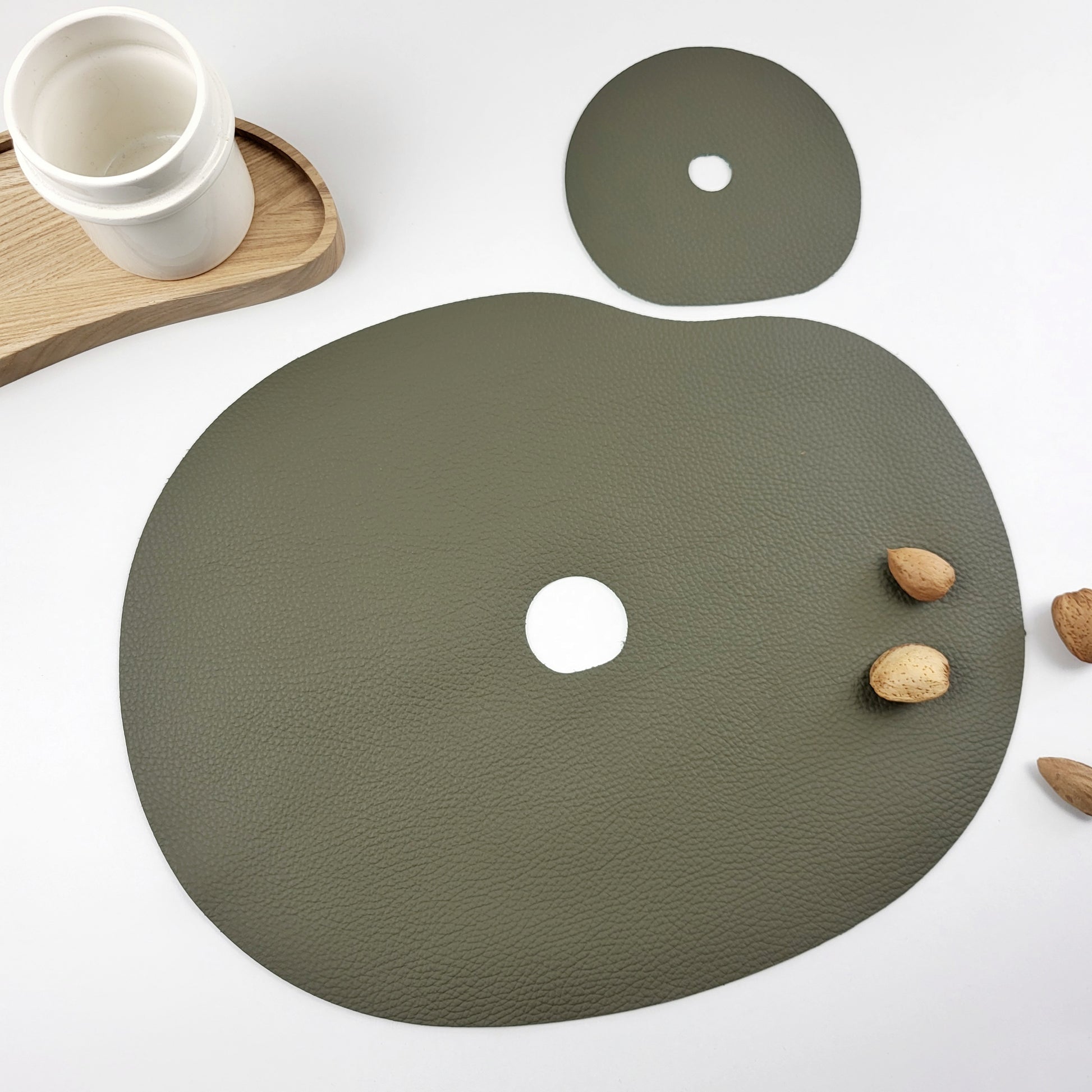 MATERIALIEN: 100 % Leder GRÖSSE: Tischset für Teller: 36 × 29 cm Untersetzer für Tasse: 13 × 12 cm