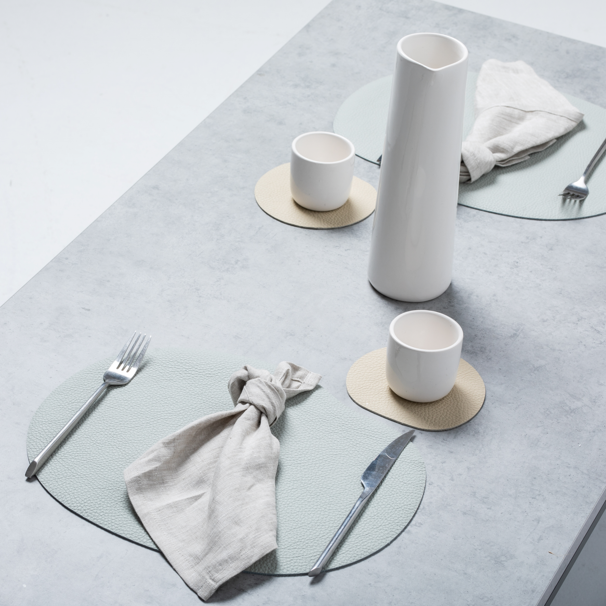 Tischsets aus Leder bestehen aus 100 % natürlichem Leder, das langlebig und feuchtigkeitsbeständig ist – ideal zum Schutz Ihrer Tischoberfläche. Leicht zu reinigen. Das Design des Tischsets ist von der Form eines alten Mühlsteins inspiriert. Das Tischset ist groß genug für einen Essteller, der Untersetzer passend für ein Glas oder eine Tasse.