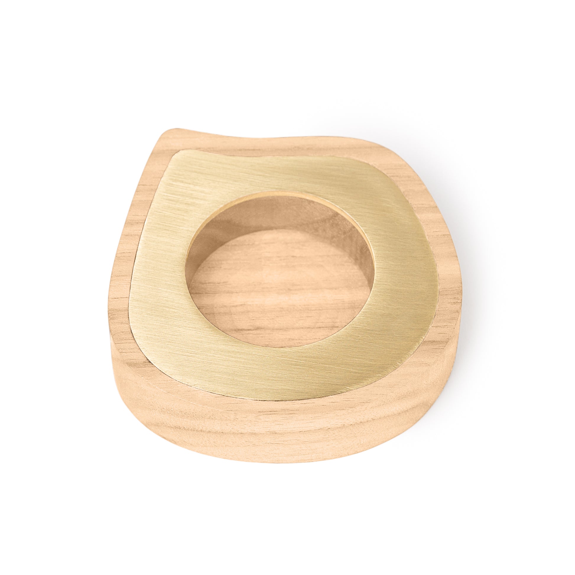 Kerzenhalter aus Holz mit ästhetischem Messingdetail. Er besticht durch ein einzigartiges, von der Natur inspiriertes Design und besteht aus langlebigen, nachhaltigen Materialien.