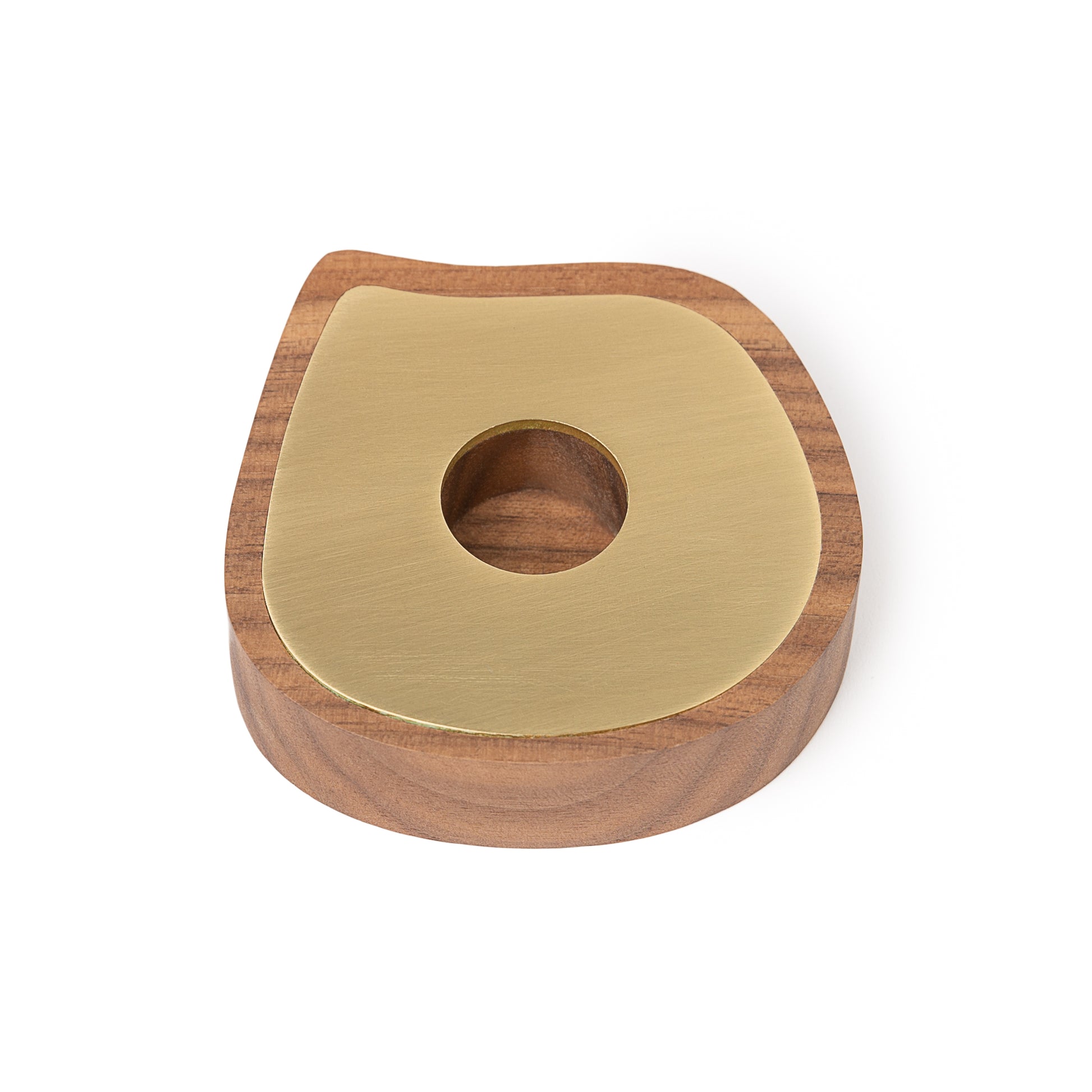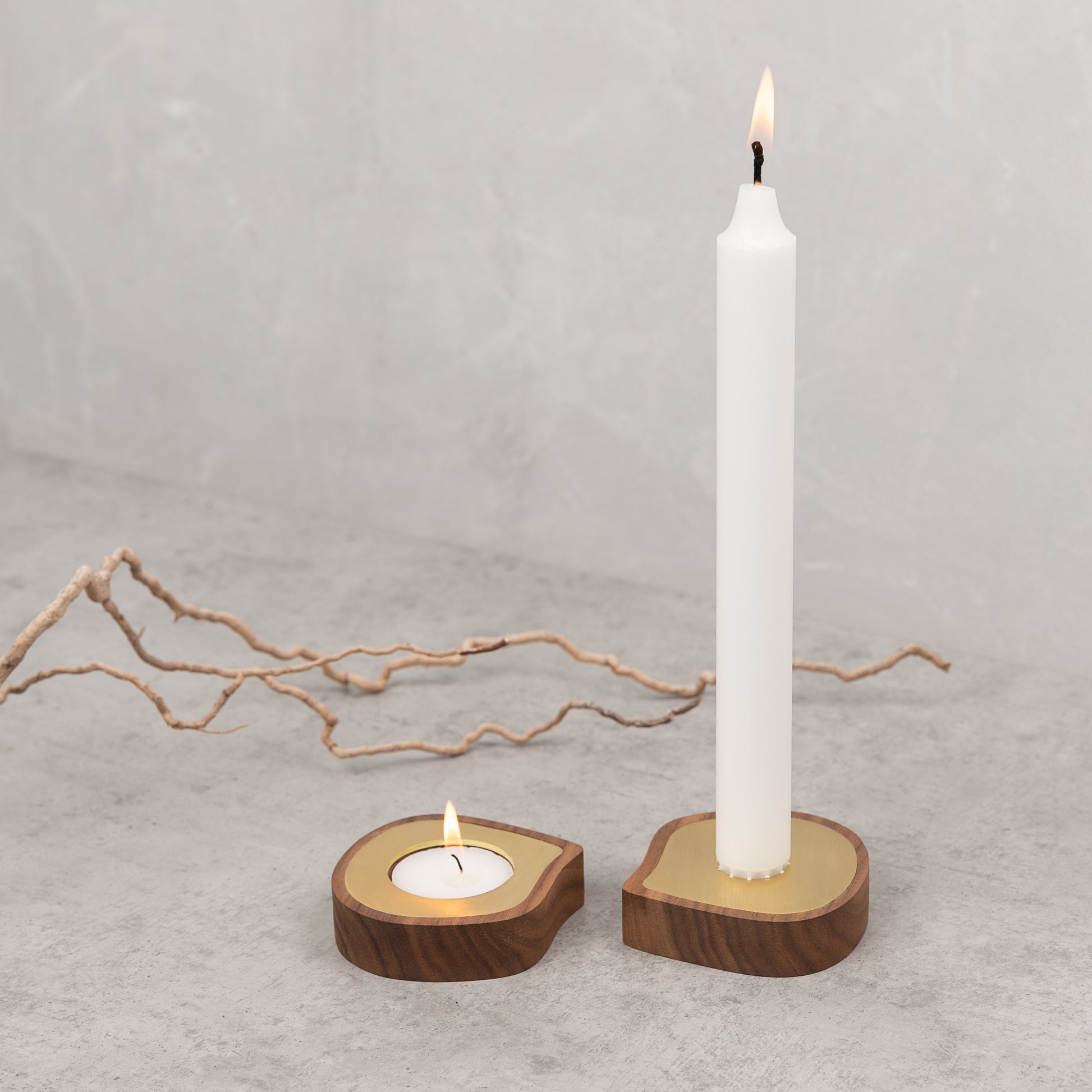 Kerzenhalter für Stabkerzen und Teelichter aus Nussbaumholz mit ästhetischem Messingdetail. Er hat ein einzigartiges, von der Natur inspiriertes Design und besteht aus langlebigen und nachhaltigen Materialien.